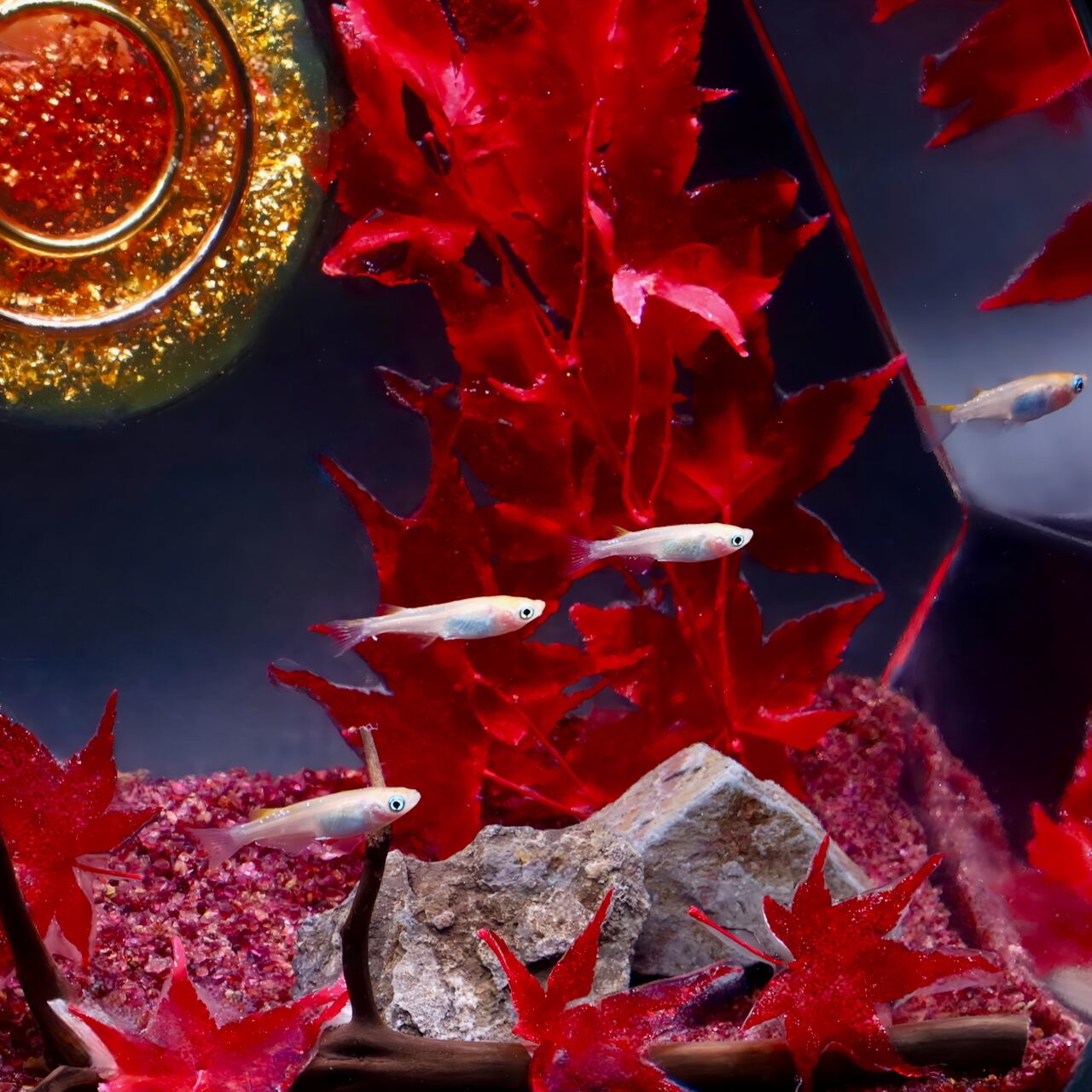 紅葉の光庭で暮らすレッドゴールドメダカとともに、