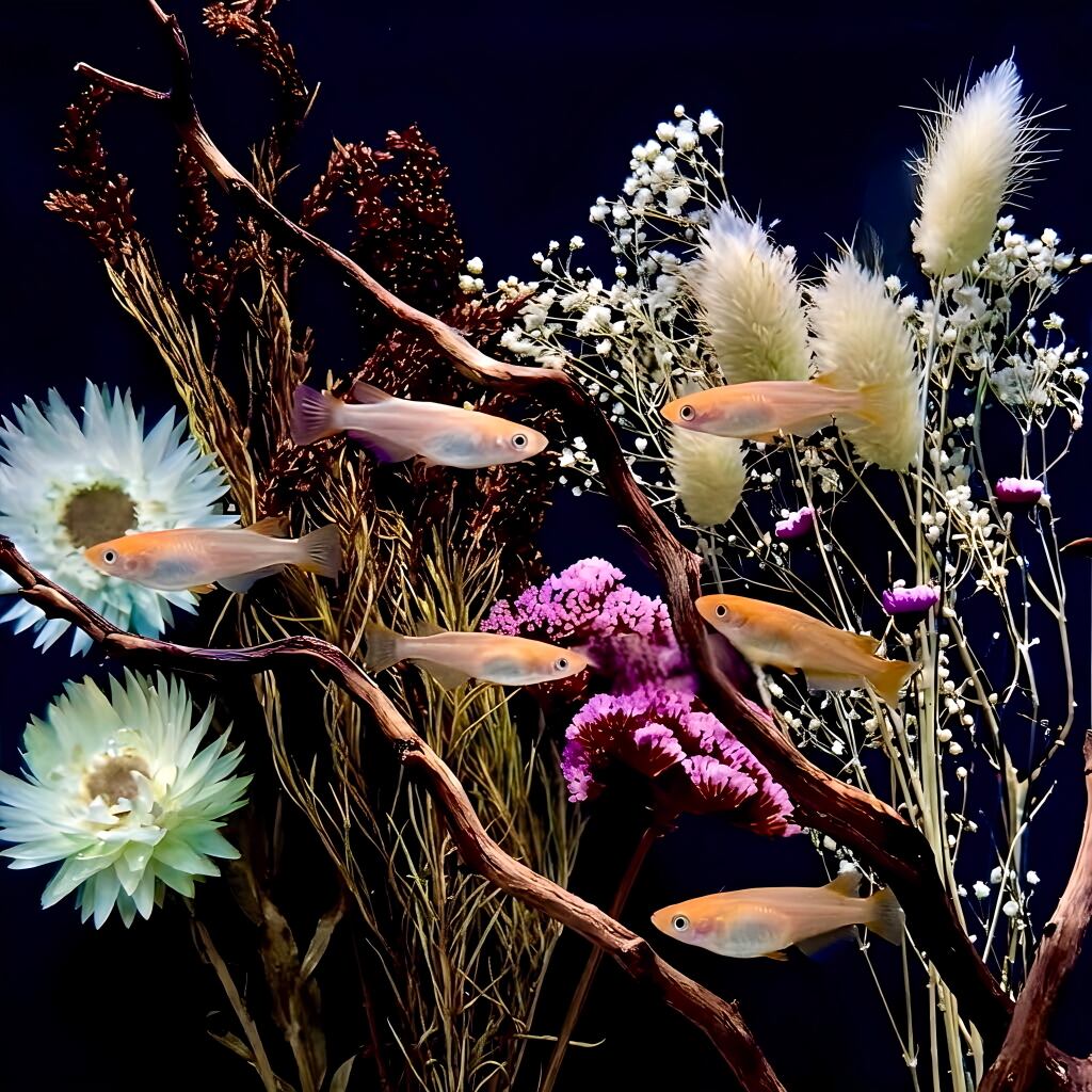 その研ぎ澄まされたモノトーンの世界を、レッドゴールドラメメダカが優雅に泳ぐ姿は、まるで動く現代アート。控えめに添えられた水景用フラワーオブジェが、空間に華やかさと品格を与えます。