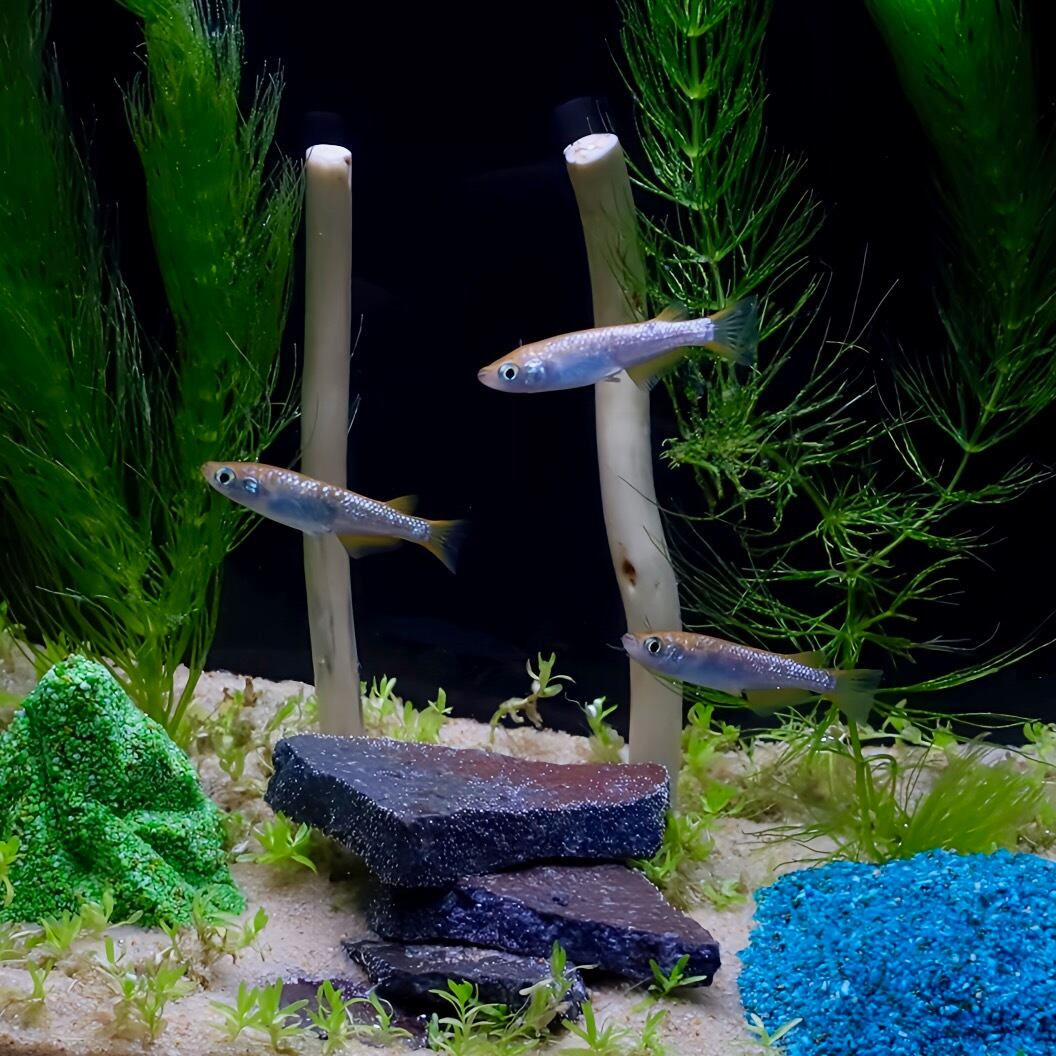 内容物:メダカ5匹(オス2匹、メス2匹、死着保証1匹)・水草・砂利・ライトグリーンの山・輝板石(きばんせき)・ブルーの砂・流木・水槽・取扱説明書